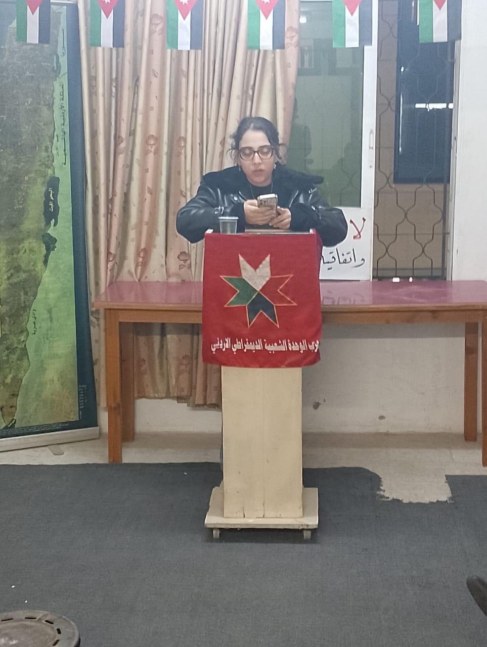 حيث قدم للحفل الرفيقة شمس شديد مرحبة بالحضور ودعوتهم للوقوف دقيقة صمت على ارواح الشهداء في فلسطين والأردن وشهداء الحرية في العالم ، وأزجت التحية لكافة الاسرى والأسيرات البواسل في سجون الكيان الصهيوني .