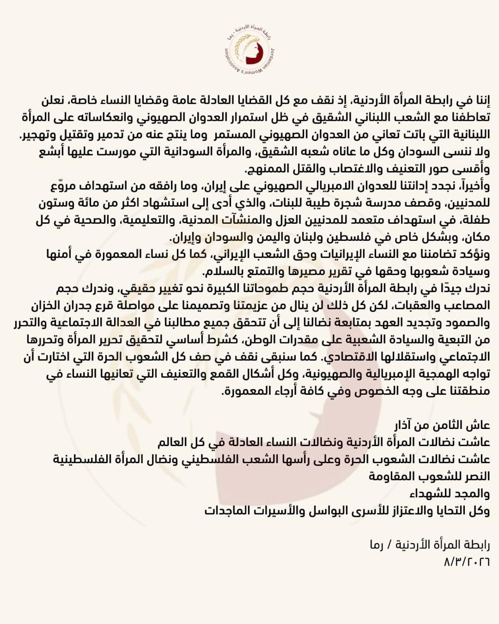 إننا في رابطة المرأة الأردنية، إذ نقف مع كل القضايا العادلة عامة وقضايا النساء خاصة، نعلن تعاطفنا مع الشعب اللبناني الشقيق في ظل استمرار العدوان الصهيوني وانعكاساته على المرأة اللبنانية التي باتت تعاني من العدوان الصهيوني المستمر وما ينتج عنه من تدمير وتقتيل وتهجير. ولا ننسى السودان وكل ما عاناه شعبه الشقيق، والمرأة السودانية التي مورست عليها أبشع وأقسى صور التعنيف والاغتصاب والقتل الممنهج.
