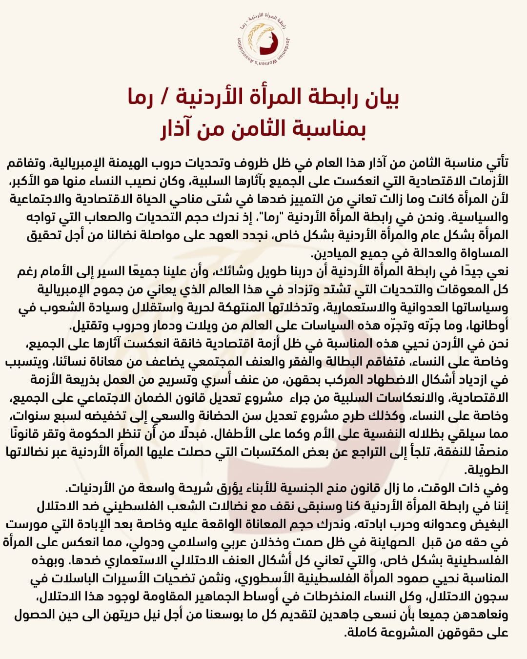 بيان رابطة المرأة الأردنية / رما بمناسبة الثامن من آذار