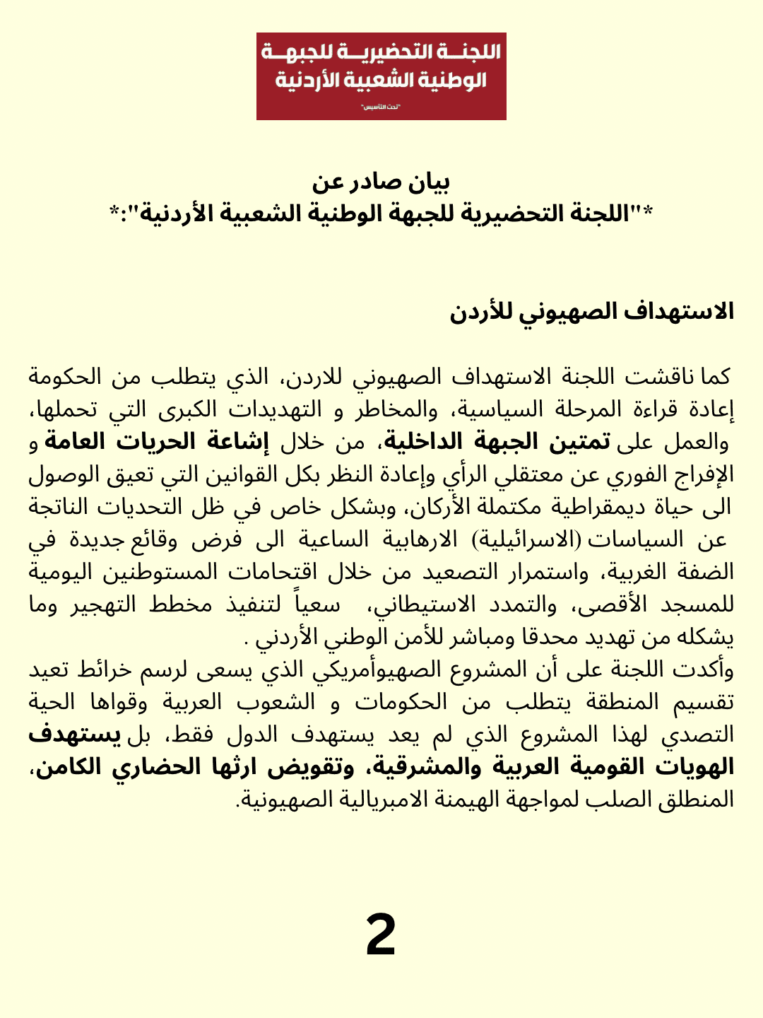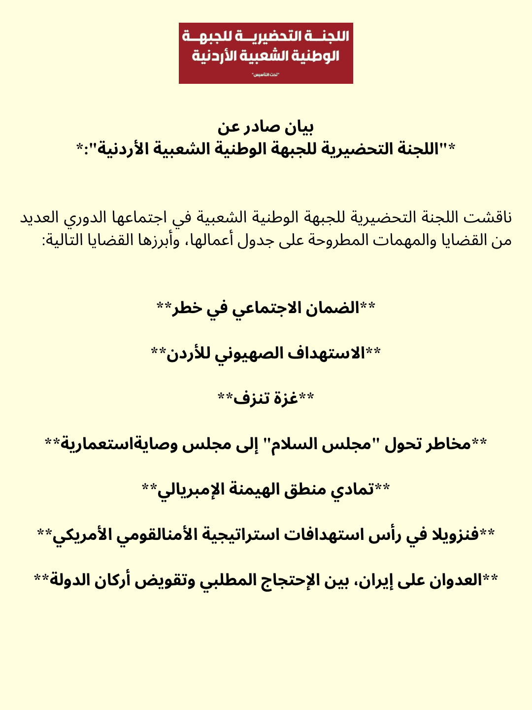 بيان صادر عن اللجنة التحضيرية للجبهة الوطنية الشعبية الاردنية