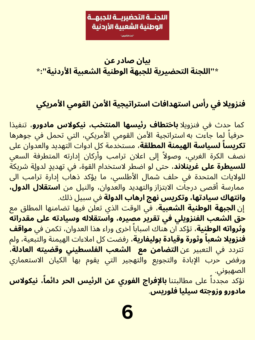 إن الجبهة الوطنية الشعبية، في الوقت الذي تعلن فيها تضامنها المطلق مع حق الشعب الفنزويلي في تقرير مصيره، واستقلاله وسيادته على مقدراته وثرواته الوطنية، تؤكد ان هناك اسباباً اخرى وراء هذا العدوان، تكمن في مواقف فنزويلا شعباً وثورة وقيادة بوليفارية، رفضت كل املاءات الهيمنة والتبعية، ولم تتردد في التعبير عن التضامن مع الشعب الفلسطيني وقضيته العادلة، ورفض حرب الإبادة والتجويع والتهجير التي يقوم بها الكيان الاستعماري الصهيوني.