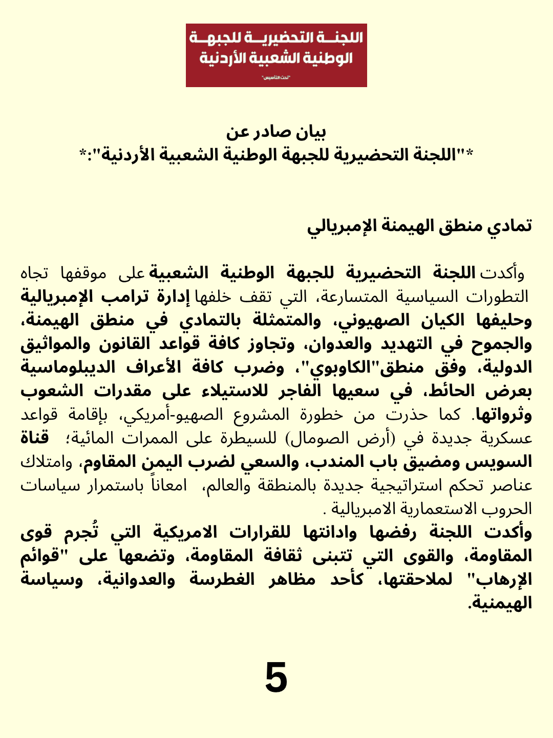 وأكدت اللجنة التحضيرية للجبهة الوطنية الشعبية على موقفها تجاه التطورات السياسية المتسارعة، التي تقف خلفها إدارة ترامب الإمبريالية وحليفها الكيان الصهيوني، والمتمثلة بالتمادي في منطق الهيمنة، والجموح في التهديد والعدوان، وتجاوز كافة قواعد القانون والمواثيق الدولية، وفق منطق “الكاوبوي”، وضرب كافة الأعراف الديبلوماسية بعرض الحائط، في سعيها الفاجر للاستيلاء على مقدرات الشعوب وثرواتها. كما حذرت من خطورة المشروع الصهيو-أمريكي، بإقامة قواعد عسكرية جديدة في (أرض الصومال) للسيطرة على الممرات المائية؛ قناة السويس ومضيق باب المندب، والسعي لضرب اليمن المقاوم، وامتلاك عناصر تحكم استراتيجية جديدة بالمنطقة والعالم، امعاناً باستمرار سياسات الحروب الاستعمارية الامبريالية .