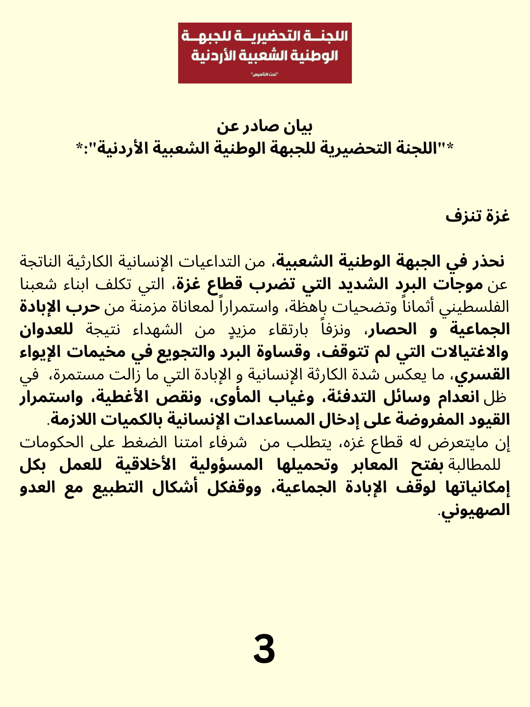نحذر في الجبهة الوطنية الشعبية، من التداعيات الإنسانية الكارثية الناتجة عن موجات البرد الشديد التي تضرب قطاع غزة، التي تكلف ابناء شعبنا الفلسطيني أثماناً وتضحيات باهظة، واستمراراً لمعاناة مزمنة من حرب الإبادة الجماعية والحصار، ونزفاً بارتقاء مزيدٍ من الشهداء نتيجة للعدوان والاعتيالات التي لم تتوقف، وقساوة البرد والتجويع في مخيمات الإيواء القسري، ما يعكس شدة الكارثة الإنسانية والإبادة التي ما زالت مستمرة، في ظل انعدام وسائل التدفئة، وغياب المأوى، ونقص الأغطية، واستمرار القيود المفروضة على إدخال المساعدات الإنسانية بالكميات اللازمة.