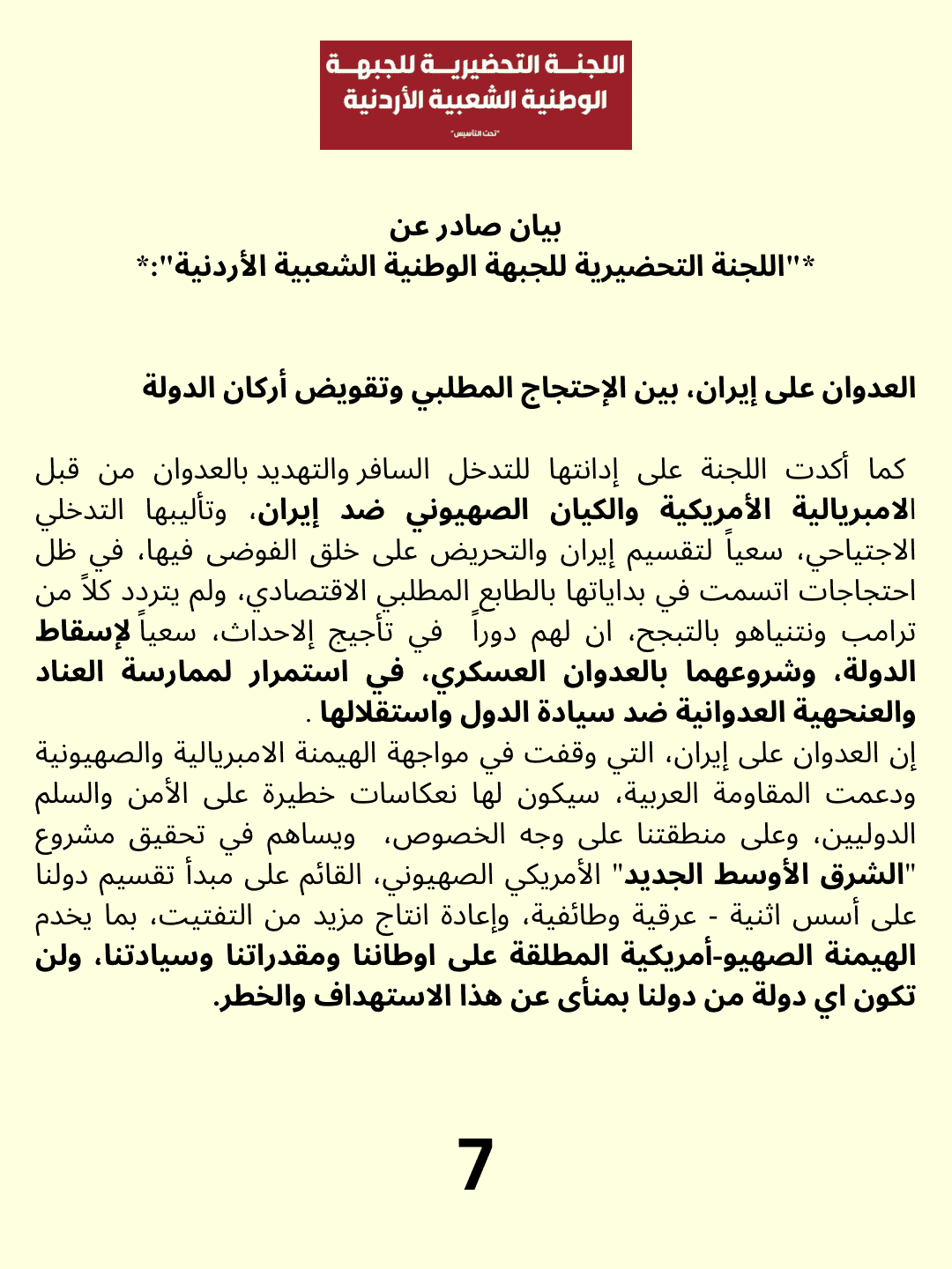 كما أكدت اللجنة على إدانتها للتدخل السافر والتهديد بالعدوان من قبل الامبريالية الأمريكية والكيان الصهيوني ضد إيران، وتأليبها التدخلي الاجتياحي، سعياً لتقسيم إيران والتحريض على خلق الفوضى فيها، في ظل احتجاجات اتسمت في بداياتها بالطابع المطلبي الاقتصادي، ولم يتردد كلاً من ترامب ونتنياهو بالتبجح، ان لهم دوراً في تأجيج إلاحداث، سعياً لإسقاط الدولة، وشروعهما بالعدوان العسكري، في استمرار لممارسة العناد والعنحهية العدوانية ضد سيادة الدول واستقلالها .