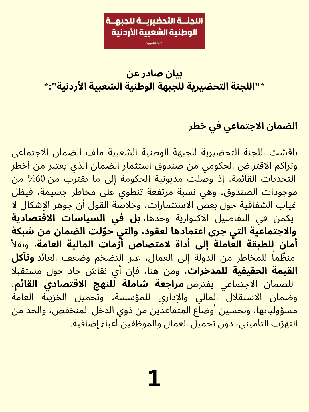 ناقشت اللجنة التحضيرية للجبهة الوطنية الشعبية ملف الضمان الاجتماعي وتراكم الاقتراض الحكومي من صندوق استثمار الضمان الذي يعتبر من أخطر التحديات القائمة، إذ وصلت مديونية الحكومة إلى ما يقترب من 60% من موجودات الصندوق، وهي نسبة مرتفعة تنطوي على مخاطر جسيمة، في ظل غياب الشفافية حول بعض الاستثمارات، وخلاصة القول أن جوهر الإشكال لا يكمن في التفاصيل الاكتوارية وحدها، بل في السياسات الاقتصادية والاجتماعية التي جرى اعتمادها لعقود، والتي حوّلت الضمان من شبكة أمان للطبقة العاملة إلى أداة لامتصاص أزمات المالية العامة، ونقلاً منظّماً للمخاطر من الدولة إلى العمال، عبر التضخم وضعف العائد وتآكل القيمة الحقيقية للمدخرات، ومن هنا، فإن أي نقاش جاد حول مستقبل الضمان الاجتماعي يفترض مراجعة شاملة للنهج الاقتصادي القائم، وضمان الاستقلال المالي والإداري للمؤسسة، وتحميل الخزينة العامة مسؤولياتها، وتحسين أوضاع المتقاعدين من ذوي الدخل المنخفض، والحد من التهرّب التأميني، دون تحميل العمال والموظفين أعباء إضافية.